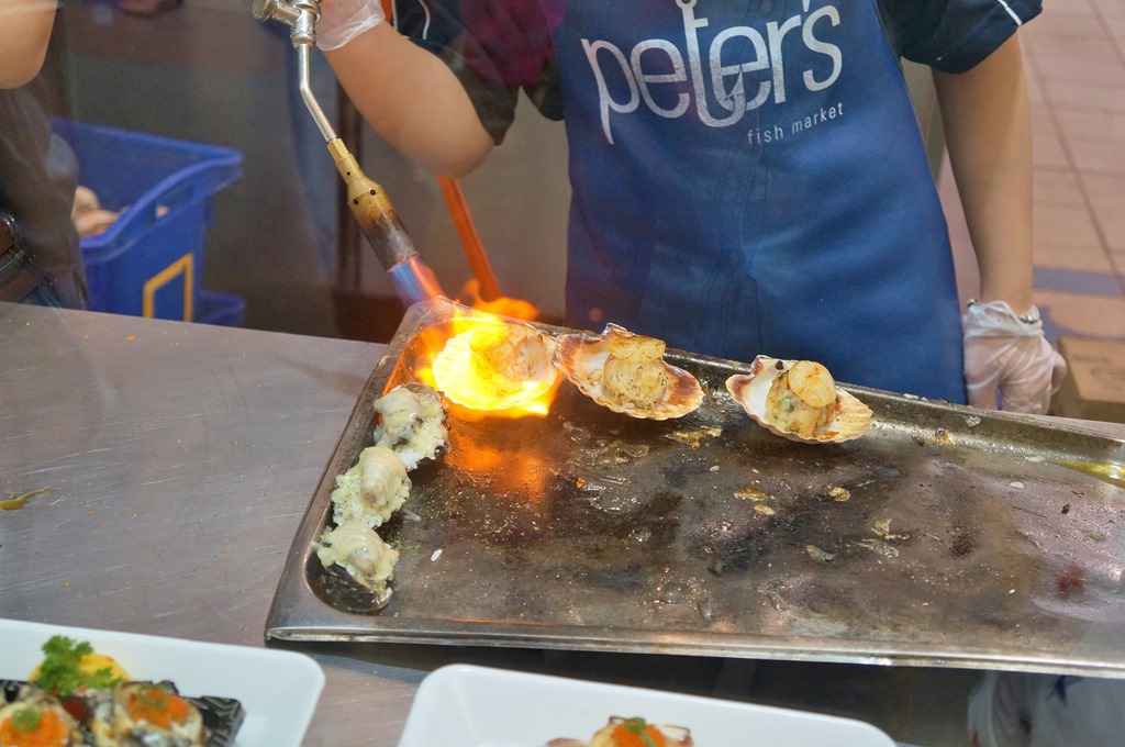 1920 mit der Gasflamme werden Muschelgerichte gratiniert angeboten