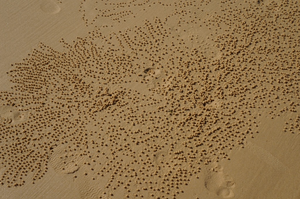 Winzige Krabben rollen kleine Sandkügelchen um ihre Löcher. Es entstehen hübsche Muster die von der nächsten Flut wieder weggespült werden.
