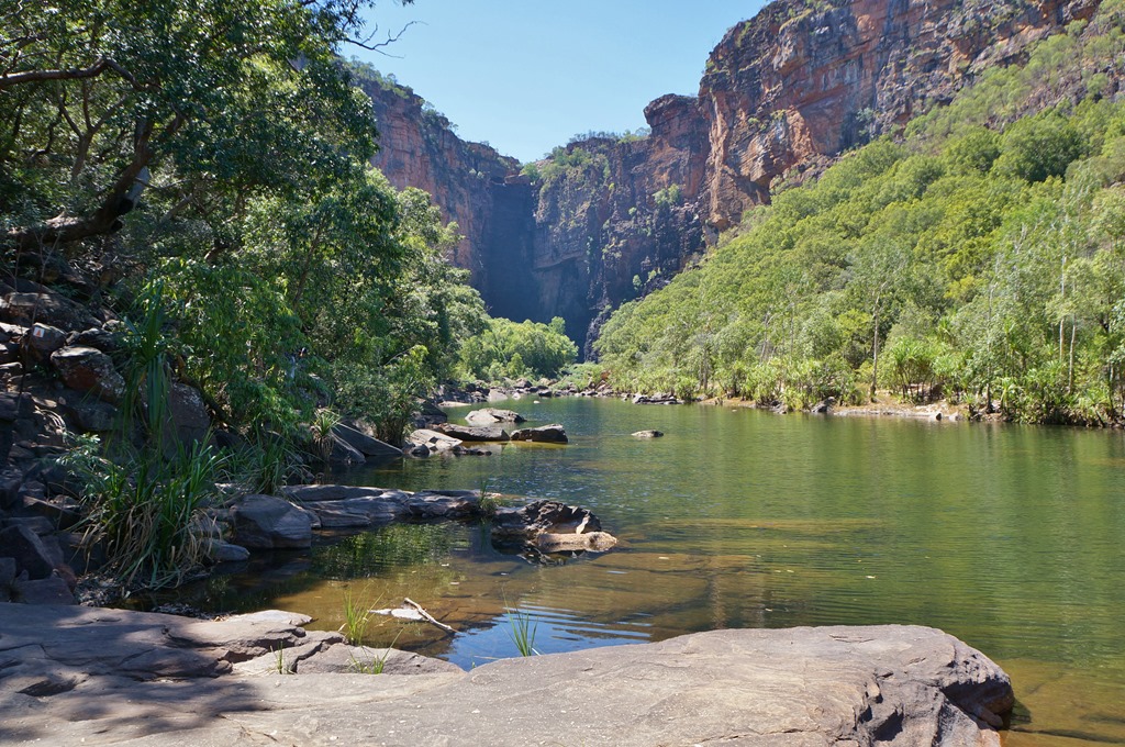 Zu Fuss, über grosse Steine, klettern wir den letzten Kilometer zum Fuss des Falls, vorbei an einem Teich. Hier steht eine Krokodilfalle. Zur Sicherheit der Touristen werden die Krokodile gefangen und umgesiedelt.