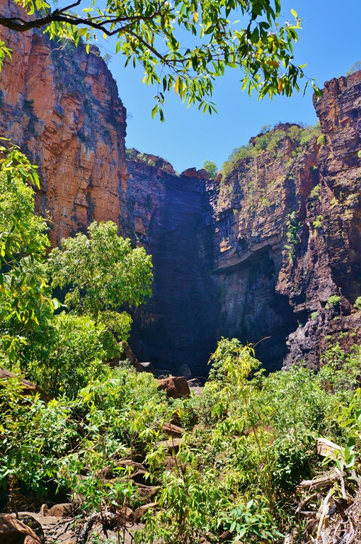 Wir stellen unser Zelt in der Gagudju Lodge in Cooinda auf. Von hier aus fahren wir am nächsten Tag etwa 50 km zu den Jim Jim Falls. Erst führt die Strecke über eine gut ausgebaute Naturstrasse. Die letzten sechs Kilometer sind aber dann nur noch ein schmaler, sandiger Track. Für unseren Frosch und seinen Fahrer jedoch kein Problem.