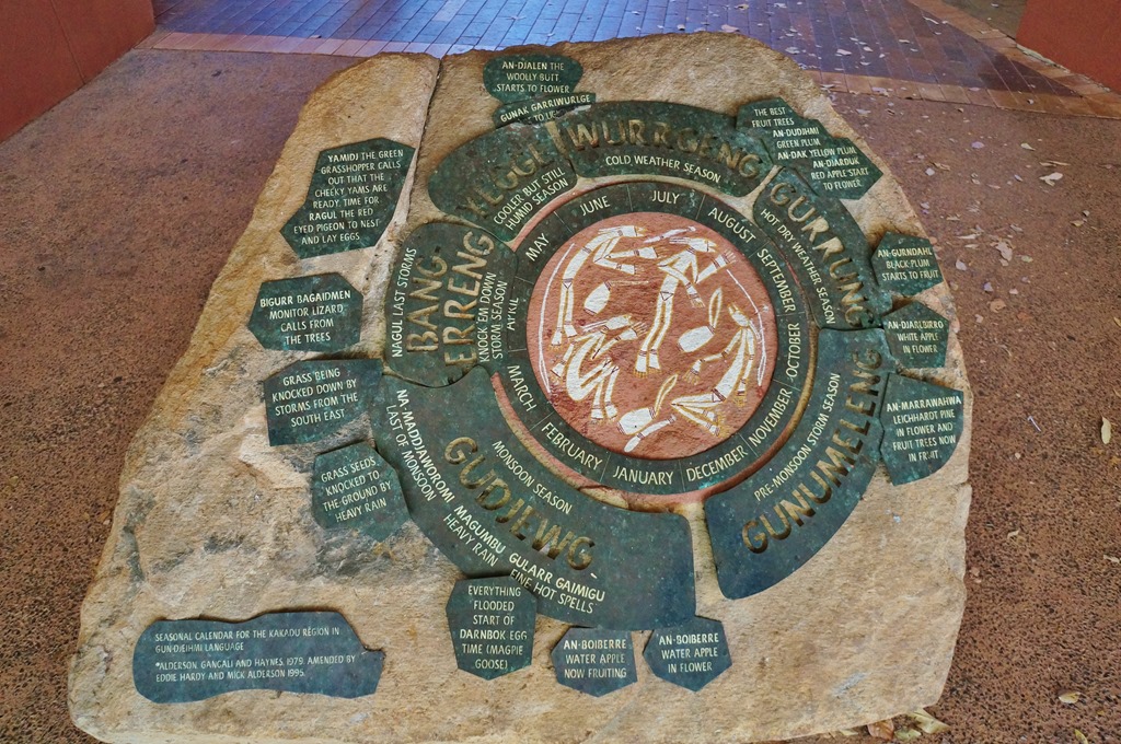 Dieser Stein beschreibt die Jahreszeiten, wie sie von den Aborigine Clans seit Jahrhunderten bezeichnet werden. Leider war Fotografieren im Innern des Centres nicht erlaubt. Die sehr anschaulich dargestellten Szenen vermitteln viele interessante Informationen über das Leben der ursprünglich hier heimischen Familiengruppen.