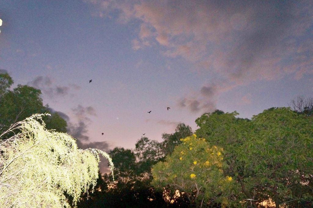 Im Camp in Jabiru sehen wir abends viele grosse Flughunde. Die Fotos täuschen ein wenig. Um die Tiere im Flug zu zeigen, musste Franz die in der Dämmerung geschossenen Fotos etwas aufhellen.