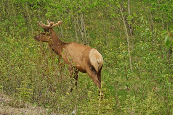 Am Wegrand begegnen wir einem jungen Red Deer das friedlich grasst und sich nicht von Spaziergängern stören lässt.
