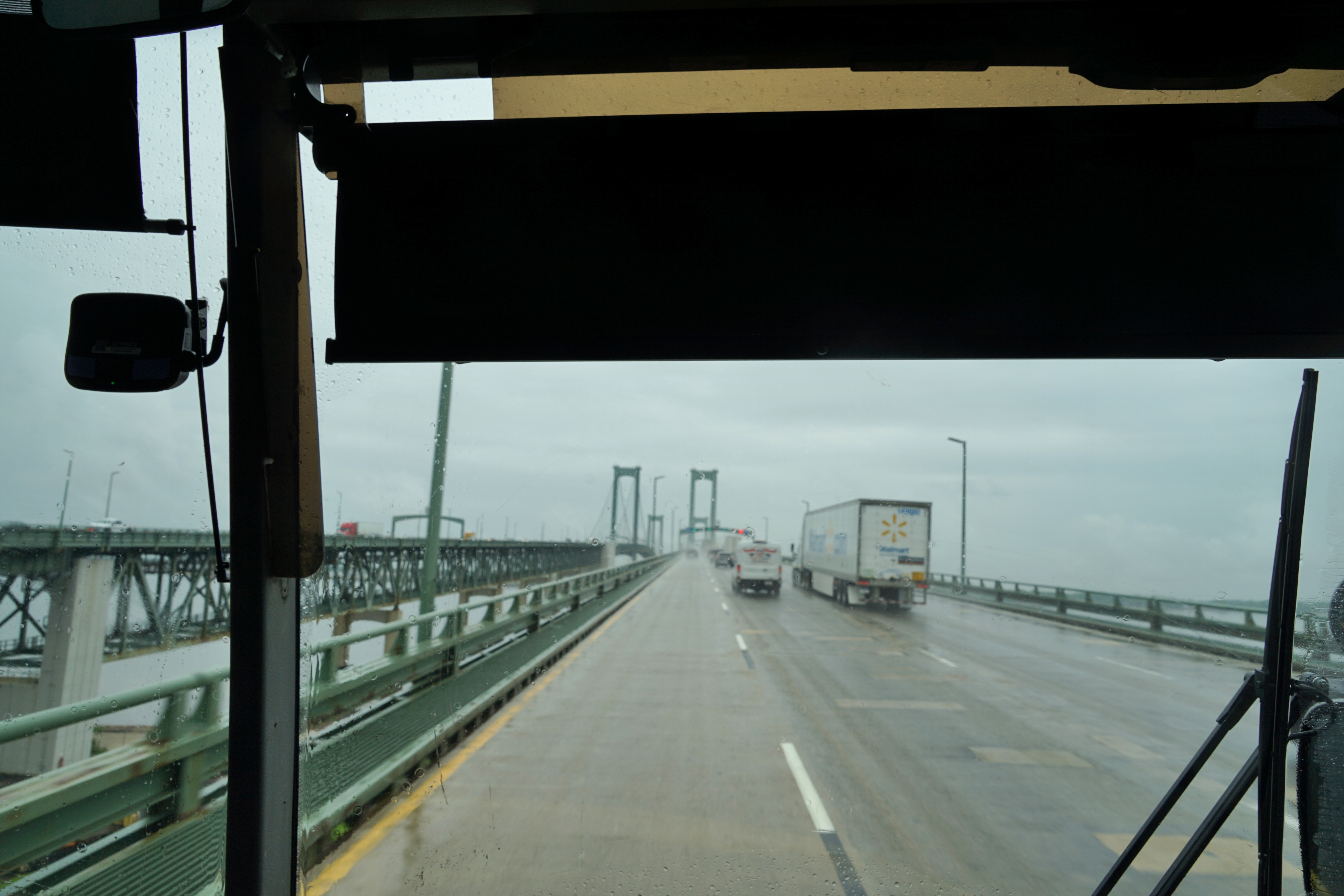 Wir haben die verschiedensten Stories gehört über die manchmal schwierige Einreise nach Kanada. Mit einem etwas mulmigen Gefühl fahren wir zur grossen Brücke die USA und Kanada verbindet. Neben einem Gebäude halten wir an und steigen aus. Es war aber nur der Duty free shop.  Wir müssen über die Brücke fahren, dort ist das kanadische Zollgebäude. Wie lange werden wir da wohl aufgehalten?