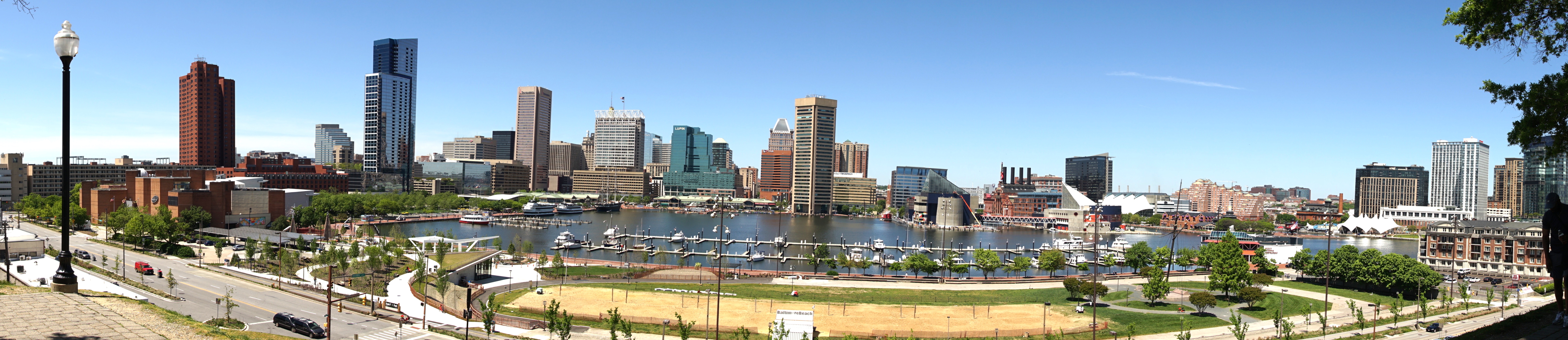 Aussicht vom Park auf den Hafen und die Stadt Baltimore.