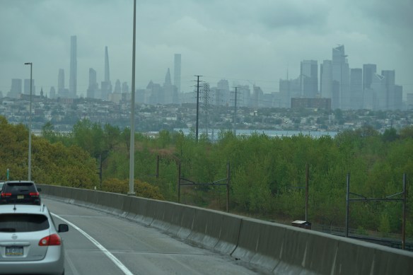 Hinter dem Regenvorhang taucht nach vier Stunden Fahrt die Skyline von New York auf.