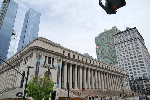 Das alte Gebäude der nationalen Post. Über den Säulen ist der Spruch: Neither snow nor rain nor heat nor gloom of night stay these couriers from the swift completion of their appointed rounds. (Weder Schnee noch Regen noch Hitze oder die Dunkelheit der Nacht bremst diese Kuriere in der zügigen Erfüllung ihrer Runden.) Oft wünscht man sich, dass dieser Leitfaden auch in der heutigen Schweiz noch Gültigkeit hätte.