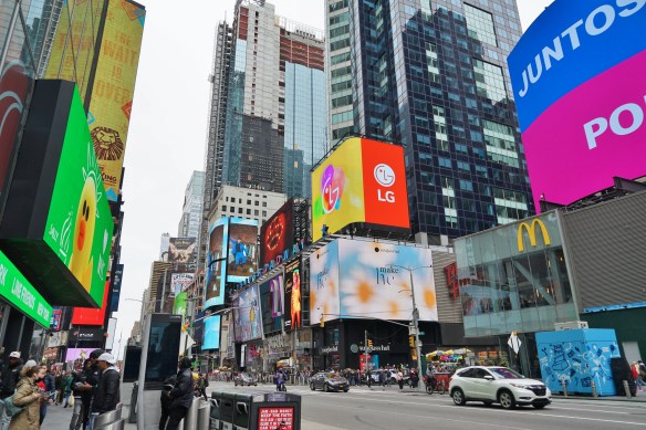 Dieser Platz pulsiert! Der Lärm ist unvorstellbar. Töne der verschiedenen Strassenmusikanten, Bravorufe für die Artisten, die ihre Kunststücke auf dem Platz darbieten und darüber die vielen Leute in allen möglichen Sprachen parlierend, die Farben und Töne der riesigen, blinkenden, tönenden Reklametafeln.