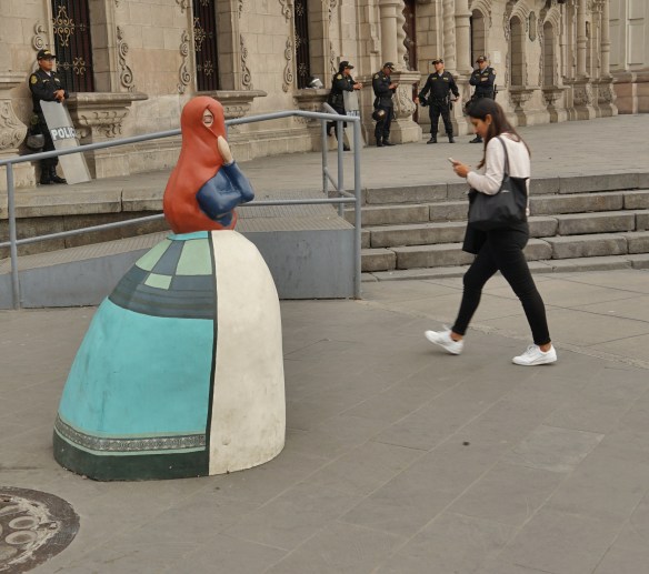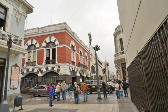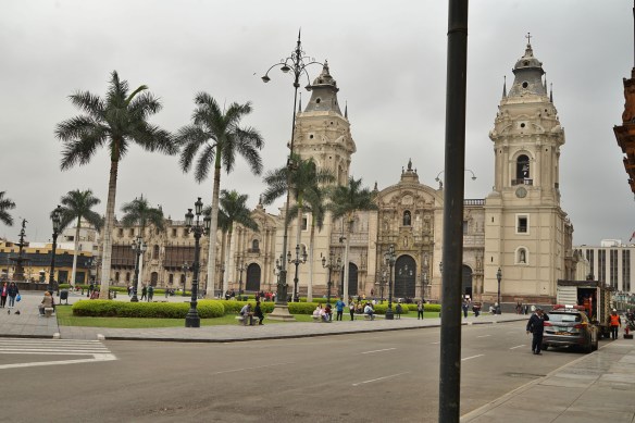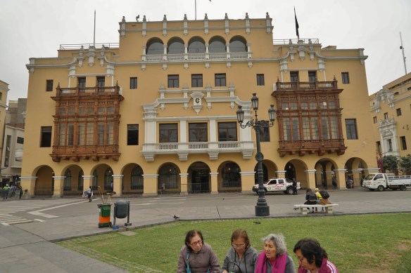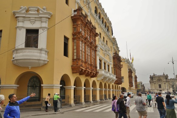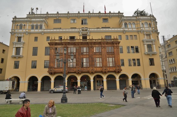 Wir kommen zur Plaza Major, dem Zentrumsplatz von Lima. Hier stehen die Patrizierhäuser mit den berühmten Erkern aus Holz. Je schöner und aufwändiger die Schnitzereien, desto reicher der Besitzer des Hauses.