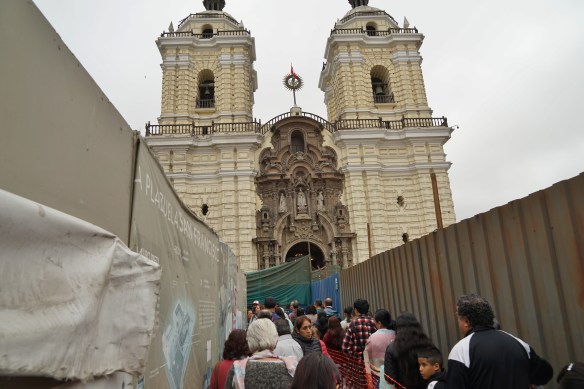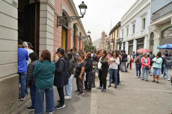 In dieser Schlange mussten wir anstehen um die berühmten Katakomben und das Museum der Iglesia y Convento San Francisco zu besuchen. Der Besuch hat sich gelohnt. Leider durften weder in den Katakomben noch im Museum Fotos gemacht werden. Eindrücklich war vor allem die wunderschöne, mehrstöckige Bibliothek mit unschätzbar wertvollen handgeschriebenen Büchern.