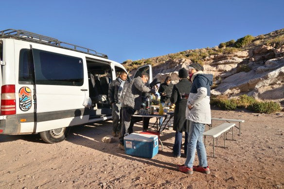 Wir bekommen unser Frühstück serviert. Jorge kocht Rühreier für die Truppe, Anita schneidet Avocados und tischt Käse, Salami und Früchte auf. Dazu gibt es wunderbar knusprige Baguettes. Unsere kalten Finger können wir nun an der Kaffeetasse wärmen. Die Sonne ist inzwischen aufgegangen.