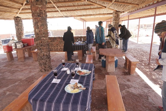 Hier wird für uns der Tisch zum Mittagessen gedeckt. Sogar Wein, selbstverständlich Chilenischer, gehört dazu. Noch immer ist es ziemlich kalt. Wir essen zwar unter Dach, aber doch immer noch im Freien.