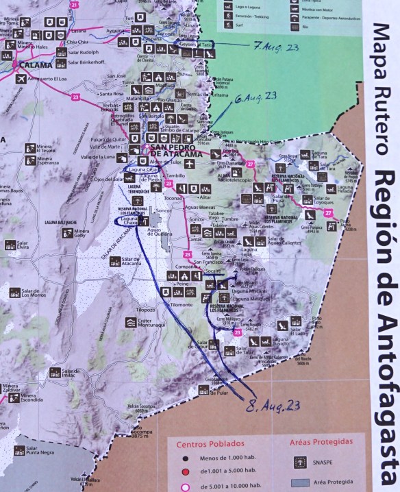 Oben ein Überblick über die Gegend von San Pedro de Atacama. Leider ist das Datum unserer Ausflüge falsch. Wir waren im Semptember hier.
