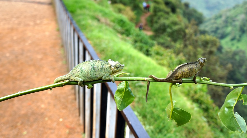 Um den Fall zu besichtigen, mussten wir Eintritt bezahlen. Viele Souvenirverkäufer waren auch da. Einer hatte auf einem Zweig Kamäleons zum fotografieren bereit.