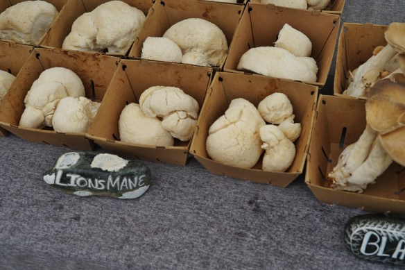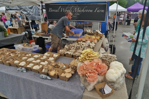 Ein vielfältiges Angebot von Zuchtpilzen steht zum Verkauf. Wir denken an feines Risotto und decken uns mit gedörrten Mischpilzen ein.