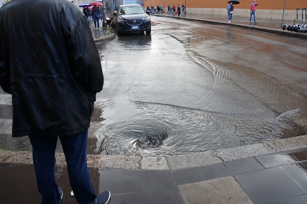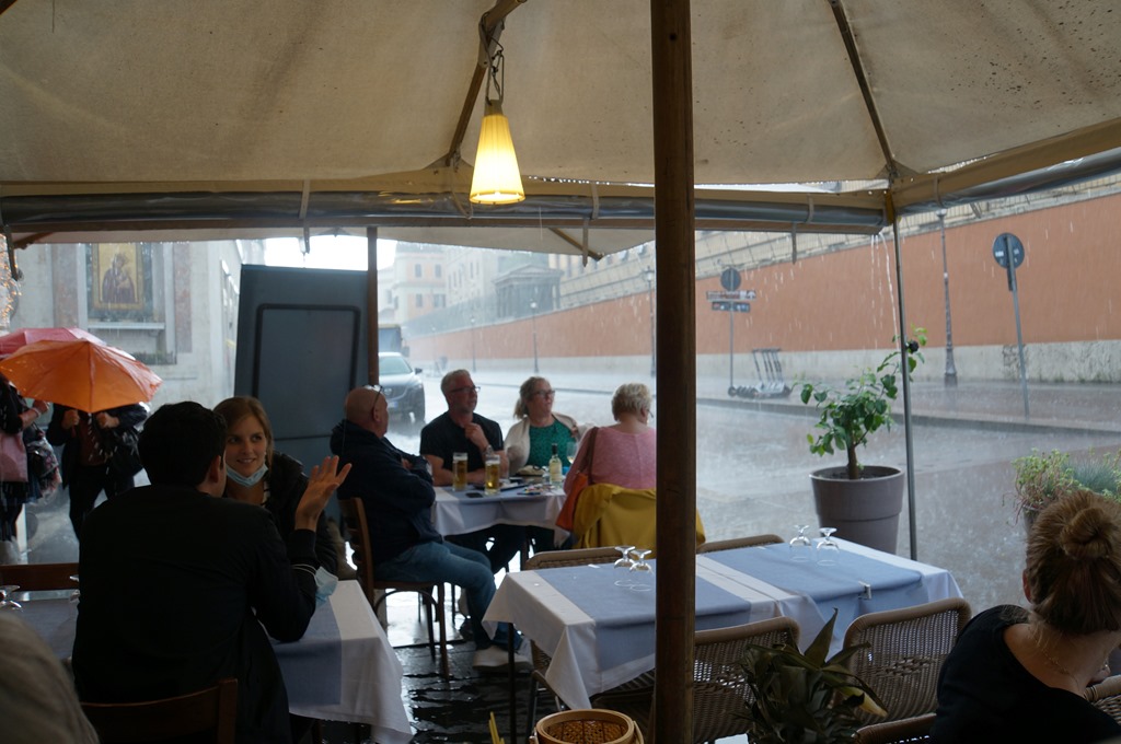 Wir suchen uns ein Restaurant für ein Mittagessen. Kaum hatten wir uns gesetzt, öffnet der Himmel alle Schleusen. Kellner helfen den wenigen im Freien sitzenden Gästen ins Trockene. Wir hatten Glück schon von Anfang an einen Tisch unter Dach zu erwischen.