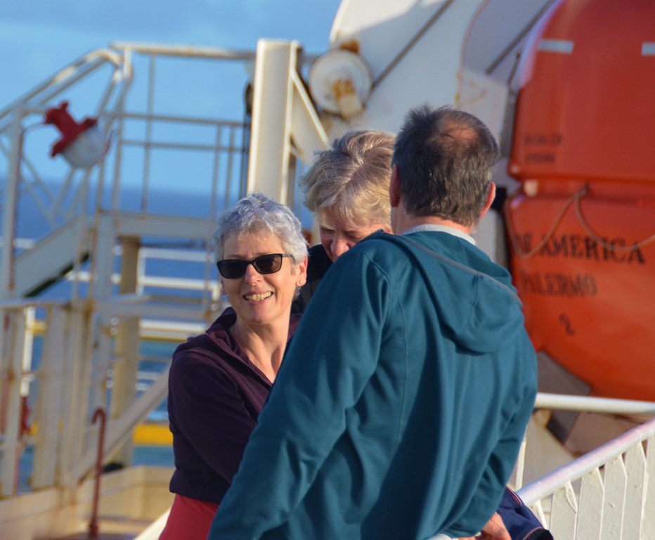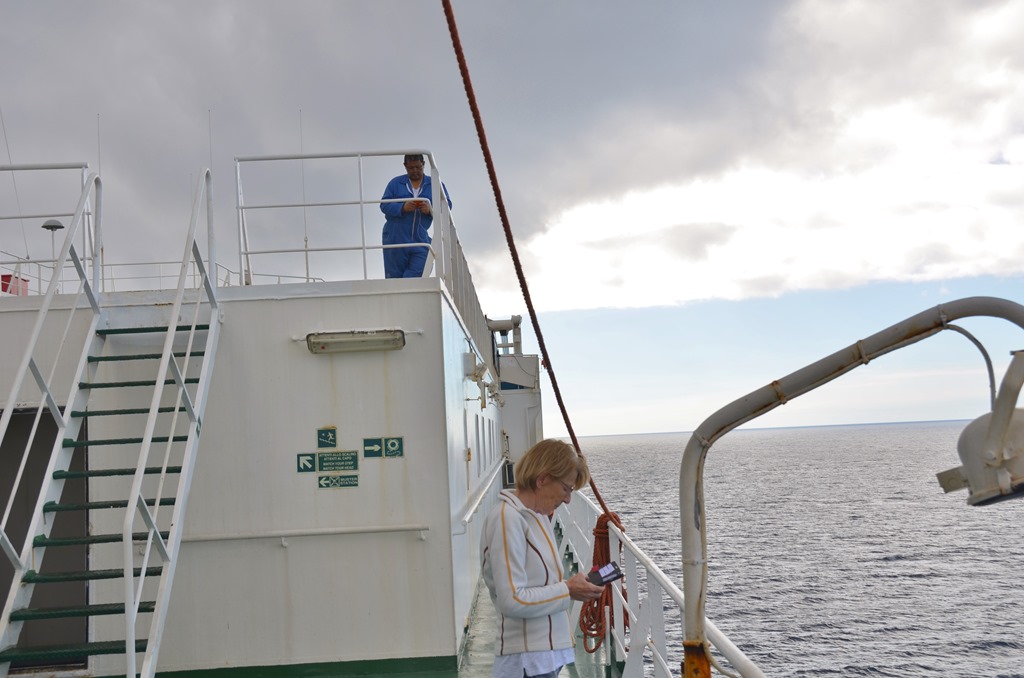 Gegen Mittag entsteht Leben auf dem Deck. Wir sind zwischen den erwähnten zwei Inseln und auf den Telefonen erscheinen die ersten Balken die Empfang anzeigen.