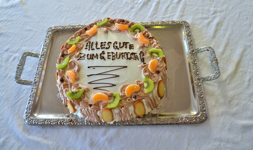 Obwohl ich meinen Geburtstag nicht wirklich feiern wollte hat die Küchenmannschaft irgendwie Wind davon bekommen. Nach dem Mittagessen wurde mit viel Trara ein riesiger Kuchen aufgefahren.