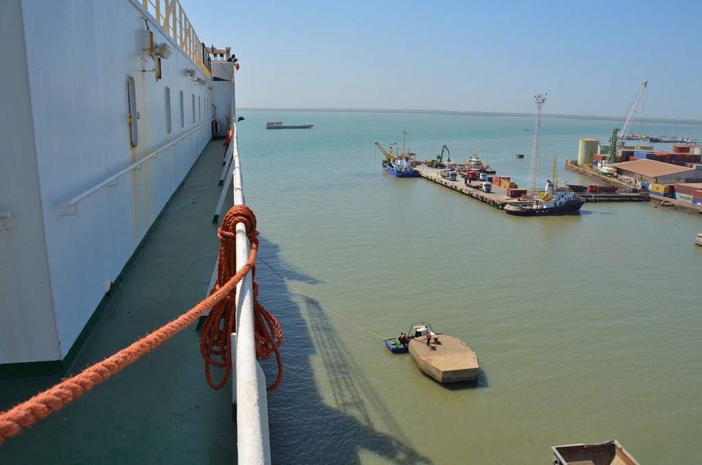 Im Hafen von Banjul können nur zwei grosse Schiffe anlegen. Der Quai ist so kurz, dass unser Schiff nur mit der hinteren Hälfte am Quai liegt. Es musste so angelegt werden damit die Rampe geöffnet werden kann.