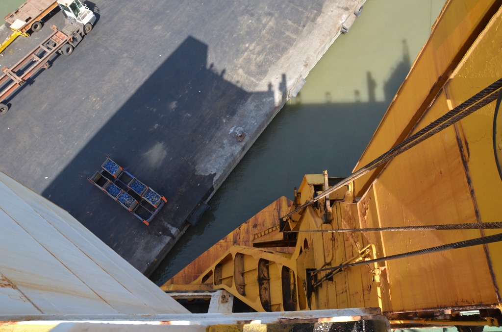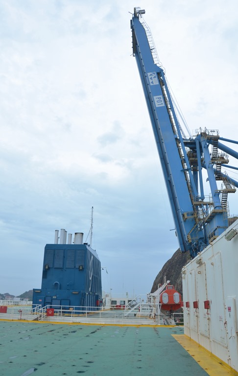 Dieser riesige Hafenkran holt die Container vom Schiff und lädt auch wieder neue auf. Es werden auch viele Autos ausgeladen. Das Schiff kann ca. 3500 Autos auf verschiedenen Decks laden. Ausserdem haben noch ca. 1000 Container Platz.