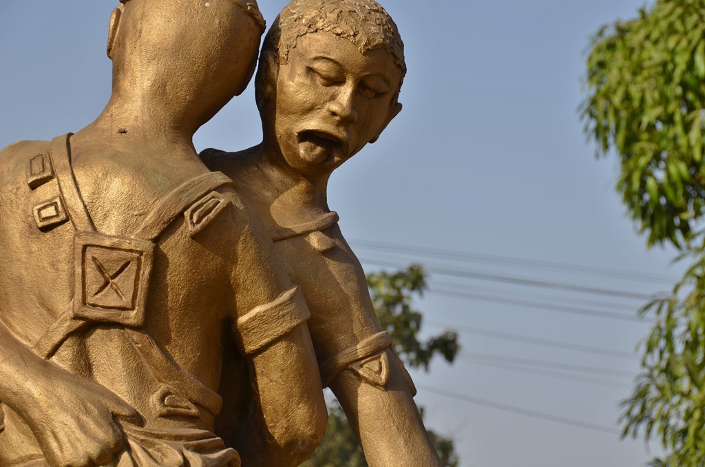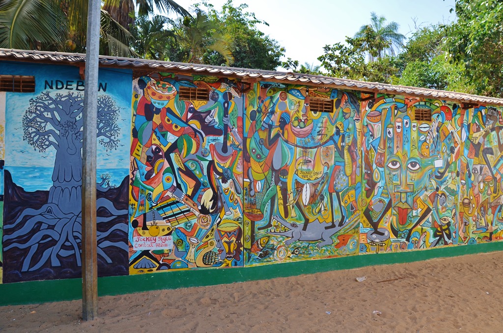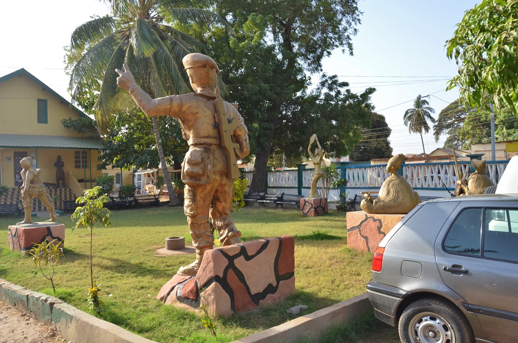 Oben Statuen im Garten des Museums. Wie rechts zu sehen ist, wird hier der Ringkampf gross geschrieben. Der Führer hat uns erzählt, dass jeden Sonntag Ringkämpfe stattfinden. Im Museum wird die Kolonialzeit sowie der Kampf um die Unabhängigkeit dokumentiert. Fotografieren ist verboten. The Gambia, wie es hier genannt wird, hat 1961 die Unabhängigkeit erreicht.