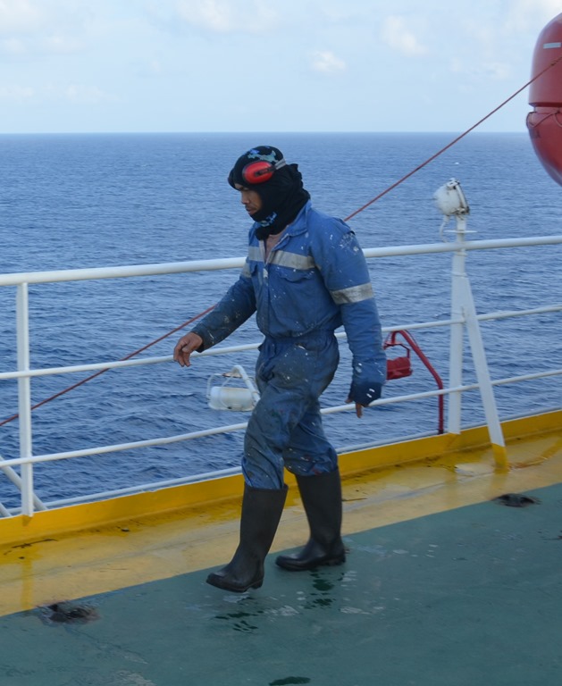 Ein ereignisloser sehr heisser Tag. Die Passagiere suchen mit den Liegestühlen einen möglichst schattigen Platz an Deck. Die Crew arbeitet trotz Hitze weiter an ihren Reparaturen.