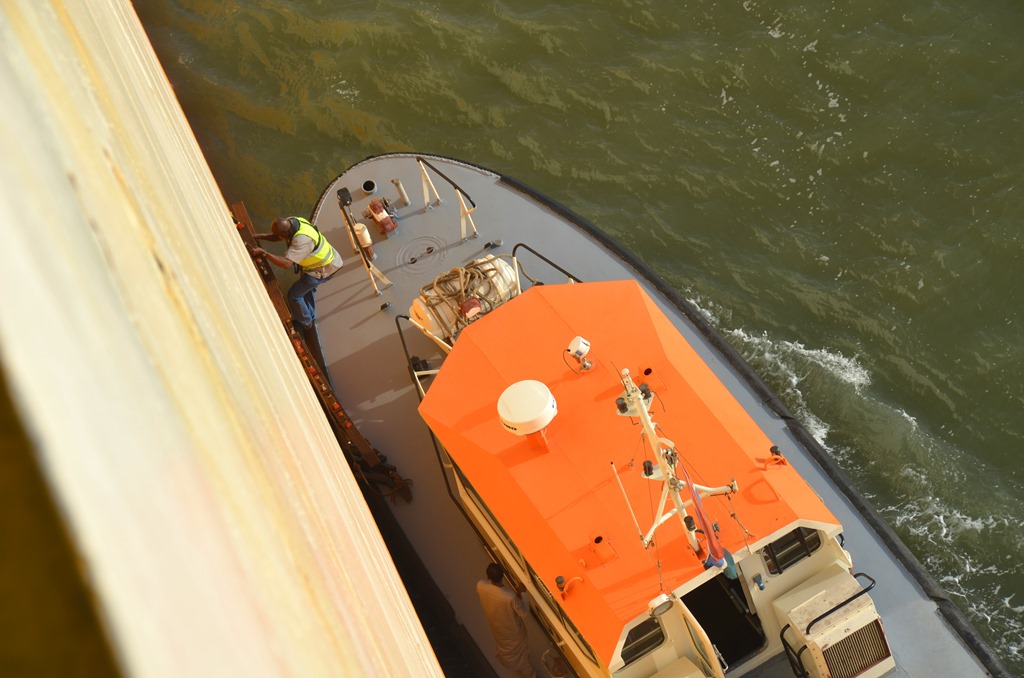 Obwohl der Lotse schon um 09.00 Uhr an Bord sein sollte, hat sich die Einfahrt in den Hafen verzögert. In Afrika herrschen eben andere Zeitbegriffe. Nun wartet die Crew mit missmutigen Gesichtern etwa zwei Stunden auf den Lotsen.