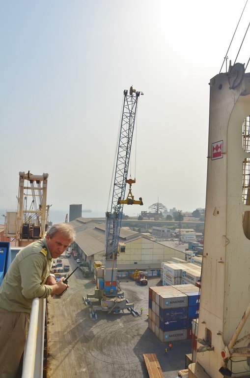 Um 10.00 Uhr hat unser Schiff im Hafen von Freetown angelegt. Hier stehen grosse Kranen zum Löschen der Ladung bereit. Es geht zügig vorwärts. Geplant ist, dass wir den Hafen heute Nacht wieder verlassen können. Wir werden dann den afrikanischen Kontinent hinter uns lassen und Südamerika ansteuern.
