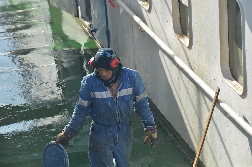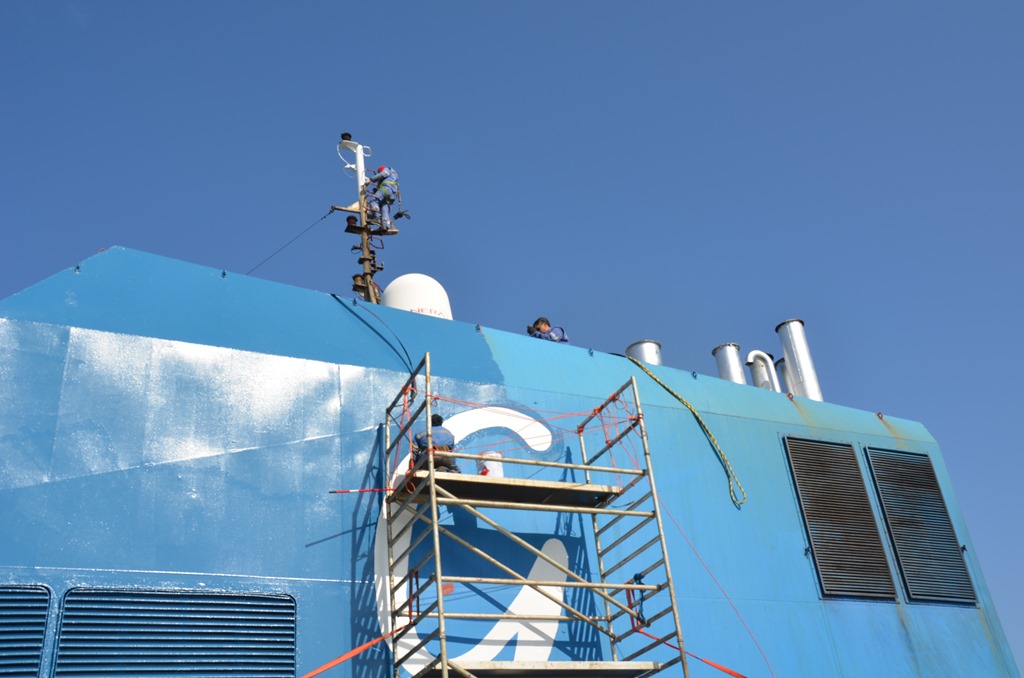 Die Crew ist ständig mit Arbeiten zur Erhaltung des Schiffs beschäftigt. Zur Zeit werden Rostflecken am Kamin- und Lüftungsturm entfernt und der Turm neu gestrichen.