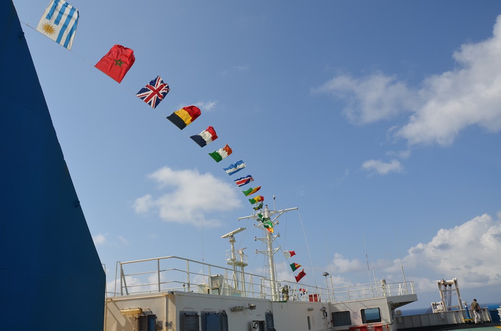 Mittlerweile werden auf Deck eine ganze Kette von Flaggen aufgezogen.