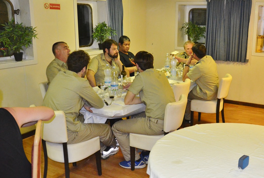 Die Offiziere bei Tisch. Oben selbstverständlich der Kapitän,hier an Bord wird er Master genannt.