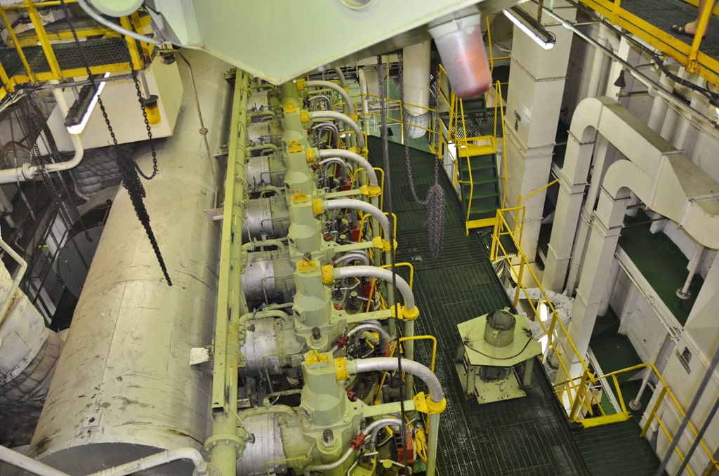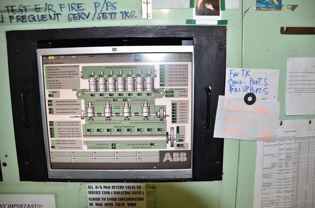 Neben dem eindrücklichen Schiffsmotor mit sieben Zylindern und einer Leistung von 11’500 kw gibt es drei Generatoren mit einer Leistung von je 1’700 kw, viele kleinere Motoren und zahlreiche Kompressoren. Die Stromversorgung hat eine Spannung von 400 Volt und eine Niederspannung 230 Volt. Für die ganzen Steuerungselemente steht ein 24 Volt Netz zur Verfügung. Das ganze Schiff muss gekühlt werden. Zur Kühlung wird Meerwasser angesaugt, gereinigt und dann als “Brauchwasser” für Duschen und die Toilettenspülung verwendet. Da das Wasser erst den Motor kühlt, ist auch kein kaltes Wasser in den Leitungen. Es gibt nur warm oder heiss. Das Abwasser wird in einem Tank gesammelt, aufbereitet und wieder ins Meer gepumpt.