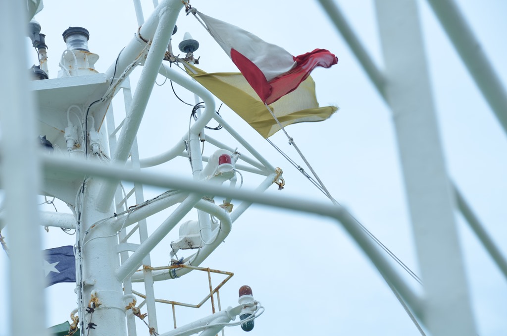 Die rot-weisse Flagge zeigt an, dass der Lotse an Bord ist. Die gelbe Flagge ist die sogenannte “Seuchenflagge” und darf erst entfernt werden wenn der zuständige Offizier des jeweiligen Landes seine Zustimmung gibt.