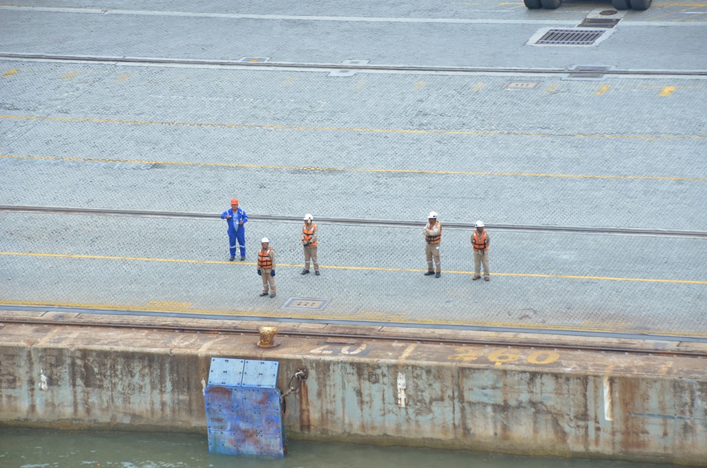 Helfer stehen bereit um die Seile entgegenzunehmen und das Schiff fest zu machen.
